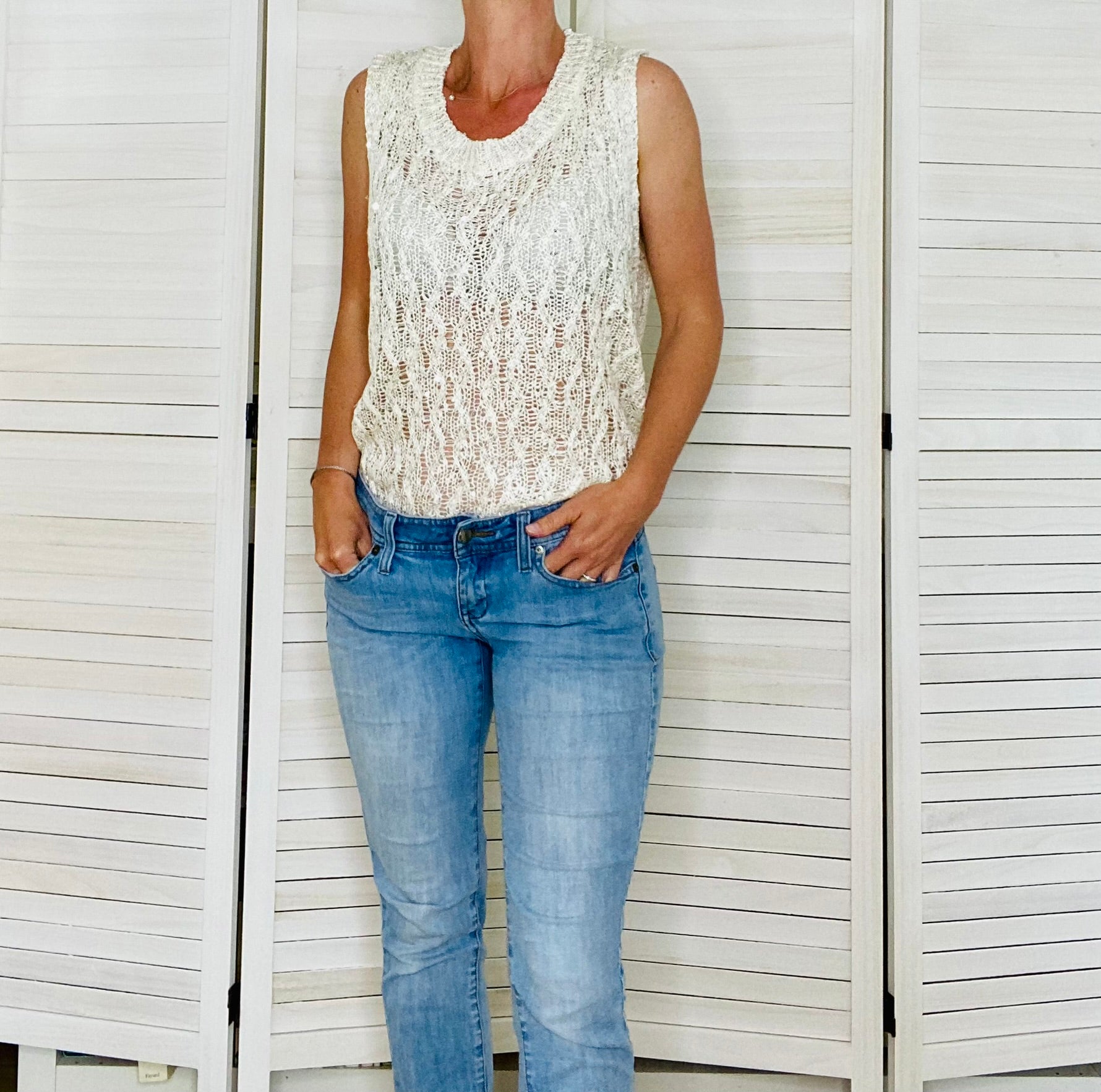 Si vous souhaitez éviter l’effet de transparence, n’hésitez pas à mettre un débardeur en dessous, comme sur la photo avec le pantalon Diane.